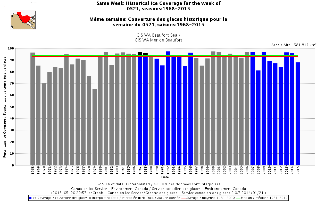 Beaufort Sea, week of 21 May (1968-2015), slightly below average.