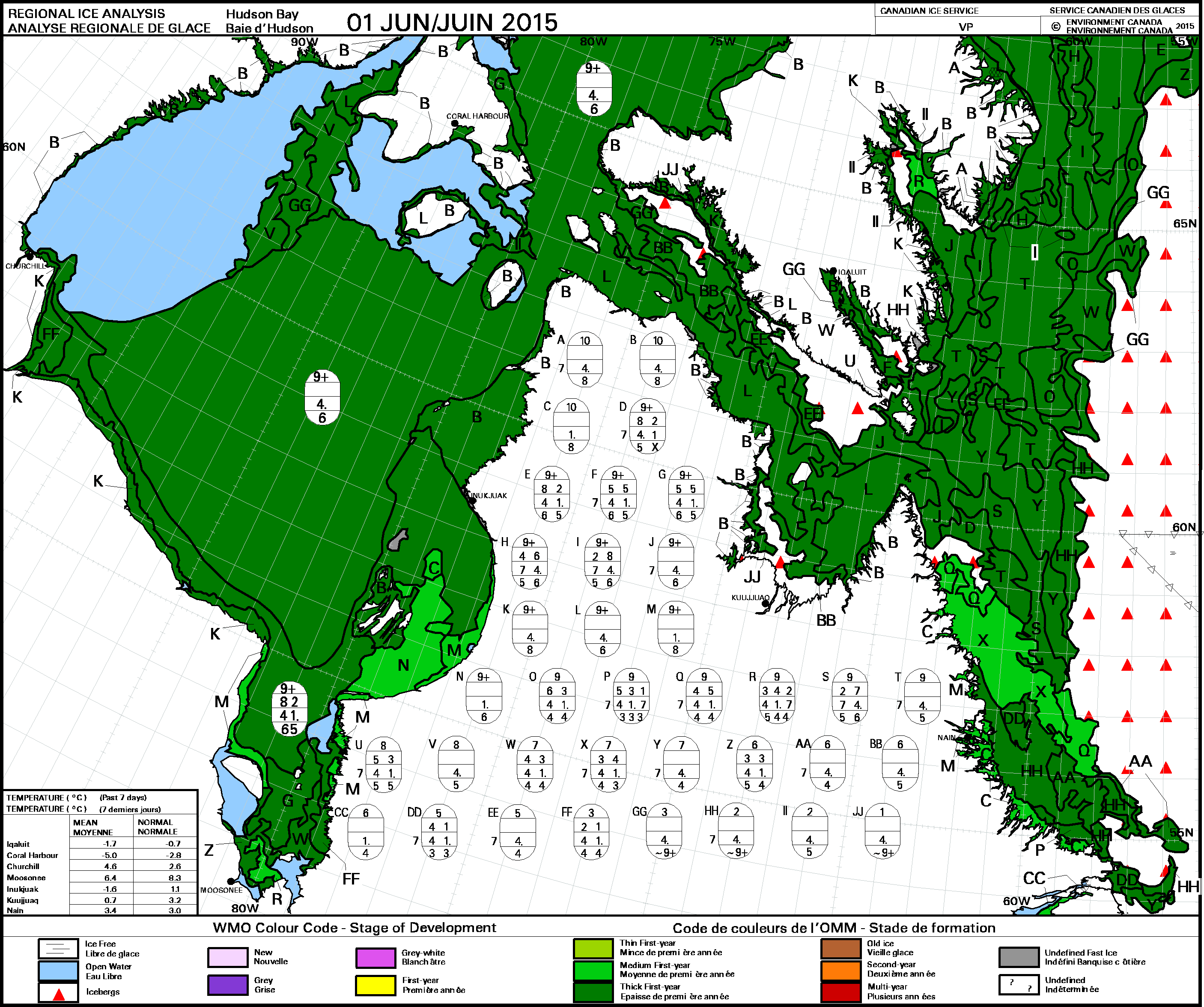 Given the state of the ice at this point in the season (Figs. 5-7 below), it’s clear that breakup by the 50% coverage definition is not imminent. Most of the ice remaining over the entire Hudson Bay at 1 June 2015 was classified as “thick first year ice” (Fig. 5):