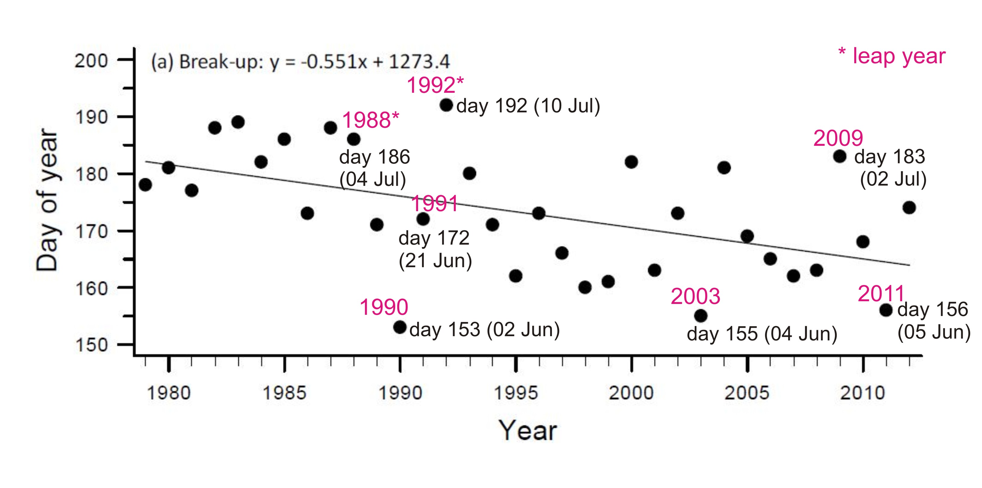 Fig. 3 shows the breakup dates published by Lunn et al. (2013) for Western Hudson Bay, which uses the 50% ice coverage definition of breakup. I’ve labelled a few of them to make it faster to see which years are early and which ones are late.