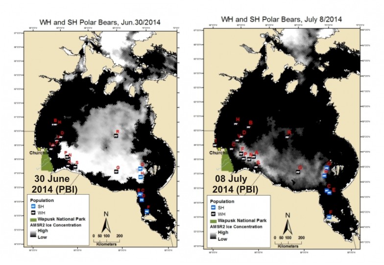Figure 1. Sea ice coverage and locations of female polar bears with tracking collars for 30 June 2014 and 8 July 2014 (black, Western Hudson Bay bears; blue, Southern Hudson Bay bears), courtesy Alysa McCall, Polar Bears International. Click to enlarge.
