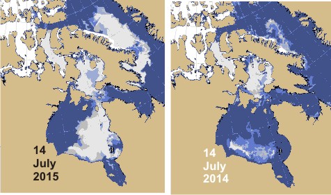 This year, there’s been nothing: not a single PBI mention of WHB breakup. Derocher tweeted a track map on 6 July (2/9 bears ashore), with no updates since, but PBI’s “Bear Tracker” has not been updated since 2 July. Compare this year’s ice cover on Hudson Bay (and elsewhere in Canada) to last year on this date (14 July): quite a difference.