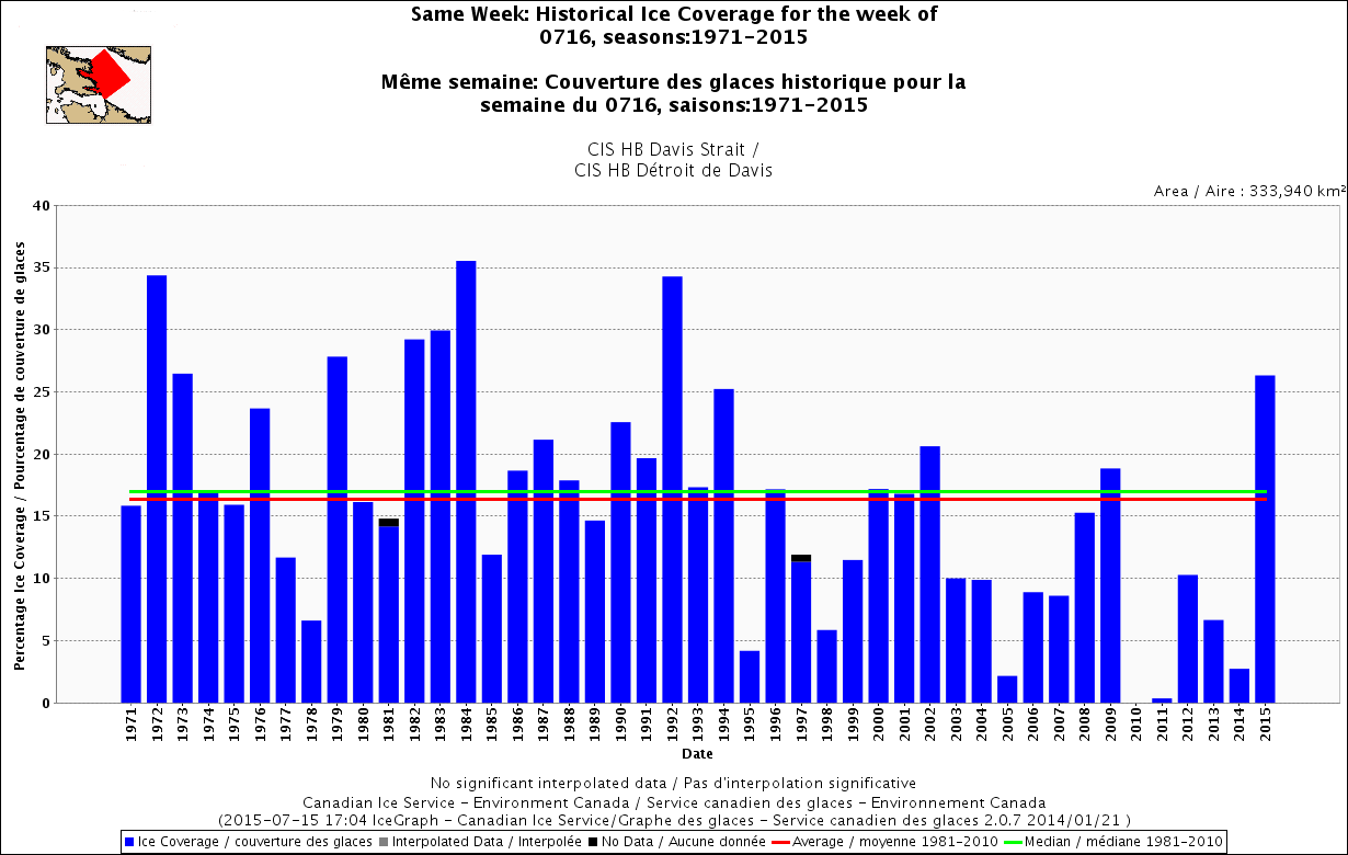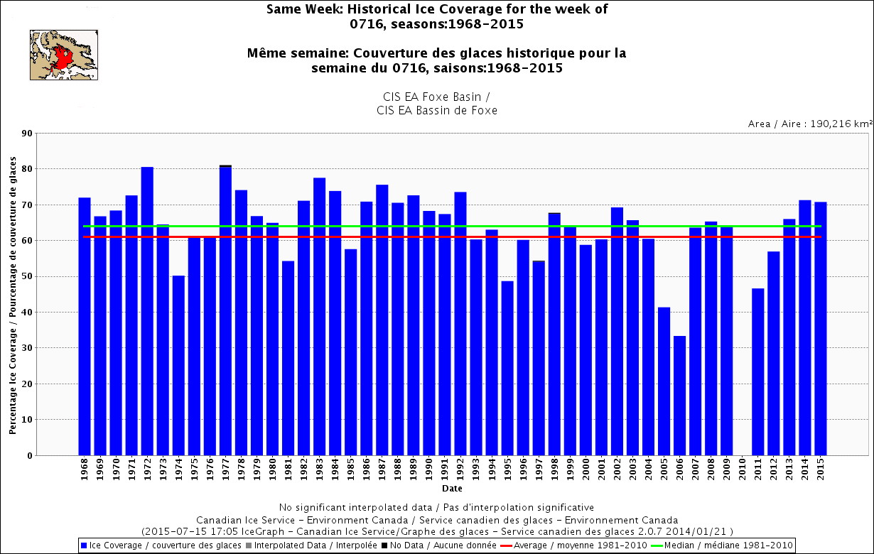 Ice coverage graphs for North American waters below for the week of 16 July, 1968/1971 to 2015 (with average marked) for Hudson Bay, Davis Strait, Foxe Basin, Baffin Bay, Beaufort Sea, Canadian Arctic (click to enlarge):