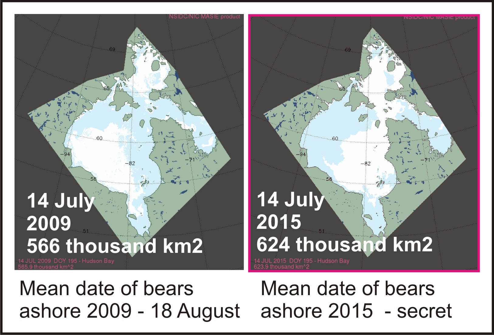 Figure 4. Sea ice extent on Hudson Bay at 15 July 2019 vs. 2015, and mean date of WHB polar bears shore. NSIDC Masie. Click to enlarge.