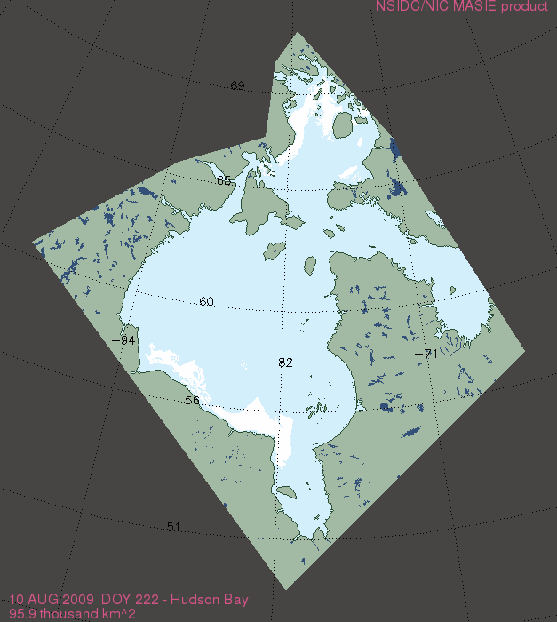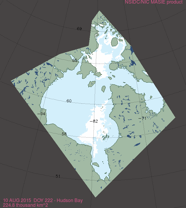 This year 225 thousand km2 of sea ice remained on Hudson Bay at 10 August compared to 96 thousand km2 in 2009, the last late breakup year for which there are detailed ice maps and polar bear data.