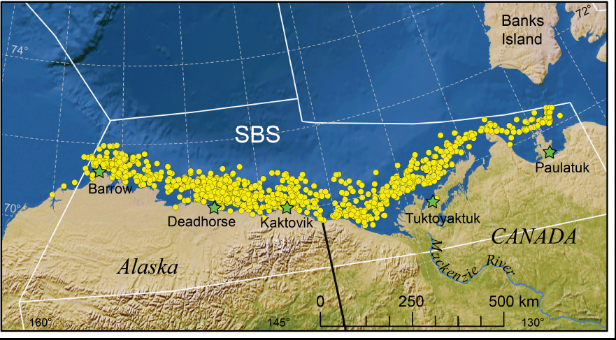 This is Fig. 1 from Bromaghin et al. 2014, showing the study area. Note about half of the Southern Beaufort Sea subpopulation is in the USA and the other half is in Canada. Canada has recently moved the eastern boundary to ~ Tuktoyaktuk.