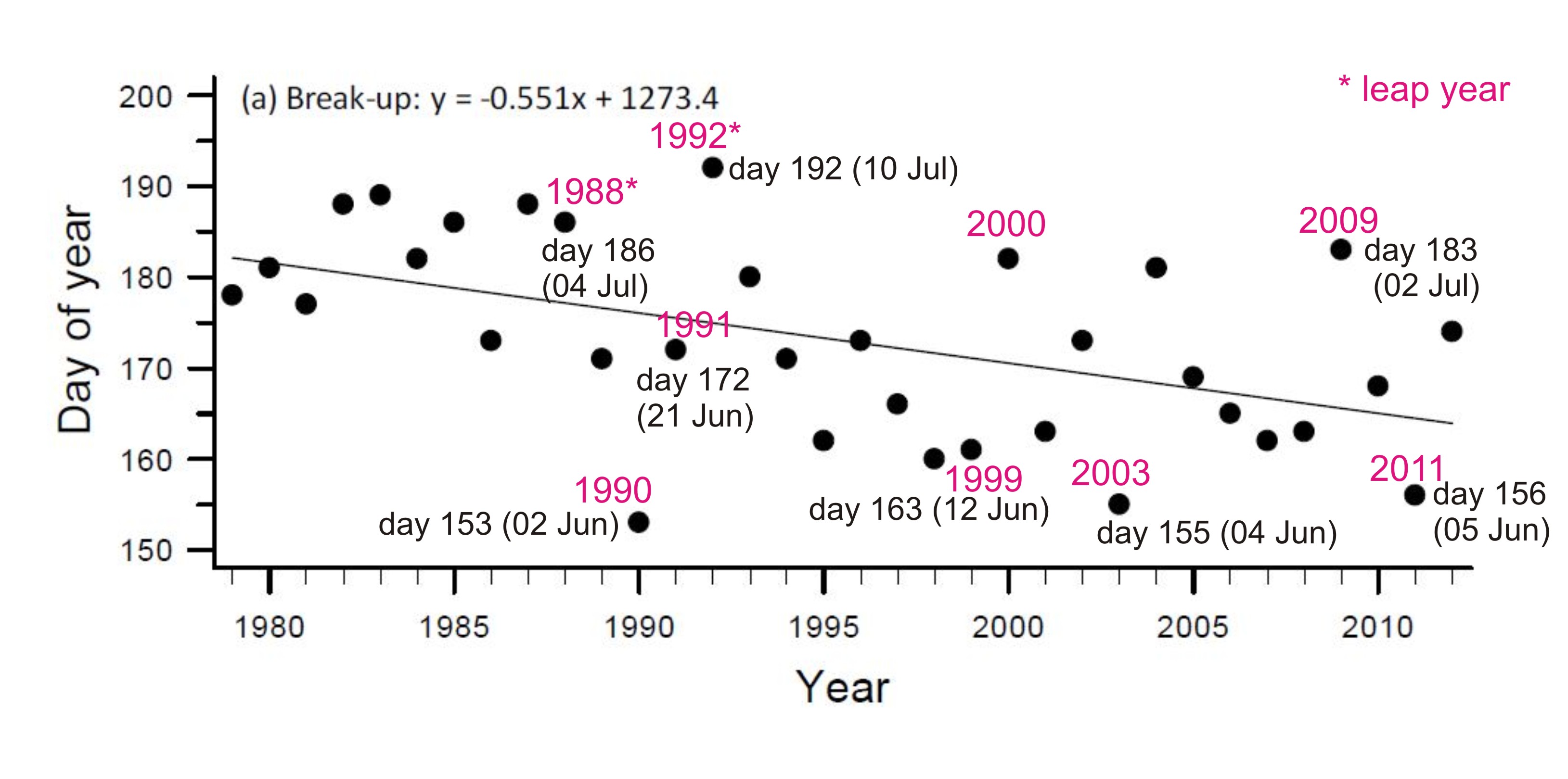 Ice coverage charts and breakup dates graph below, for context.