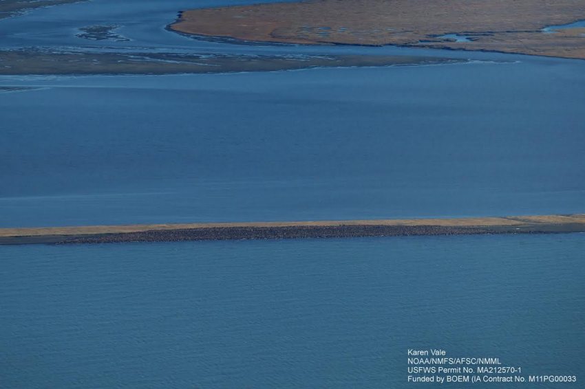 Even more strange is the fact that this year, there was no accompanying hype. There were no links in any of the stories to FWS or USGS propaganda website pages, like there were last year (nor even a link to a press release). No mention of the FWS plan to have walruses declared ‘threatened with extinction‘ because of global warming. And no mention of prosecution of the photographer who took the photos on 23 August, from the required distance, but without a permit. Note the permit number stamped on the official NOAA photo provided below (taken 2 September 2015), which few outlets carried, probably because it looks nothing like a photo of walruses on a beach: