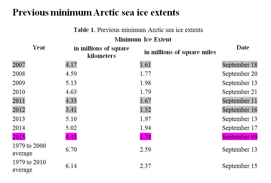 UPDATE: Below is NSIDC’s new official list of past/present sea ice minimums back to 2006 (published 15 September 2015) – click to enlarge: