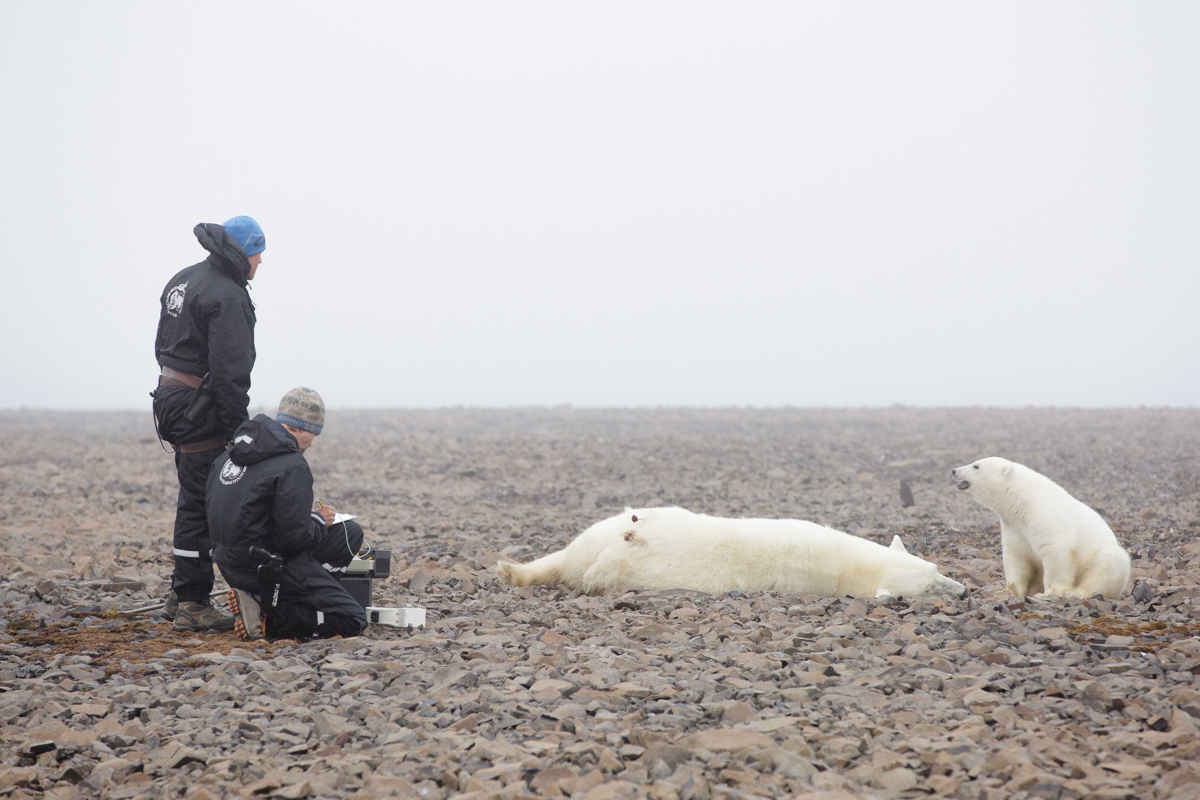 Photo above: Magnus Andersson and Jon Aars from the Norwegian Polar Institute are waiting for the anesthetic to work on polar bears. The bear is immobilized and will incur a satellite collars. A 7 month old young watching. (Photo: Nick Cobbing)