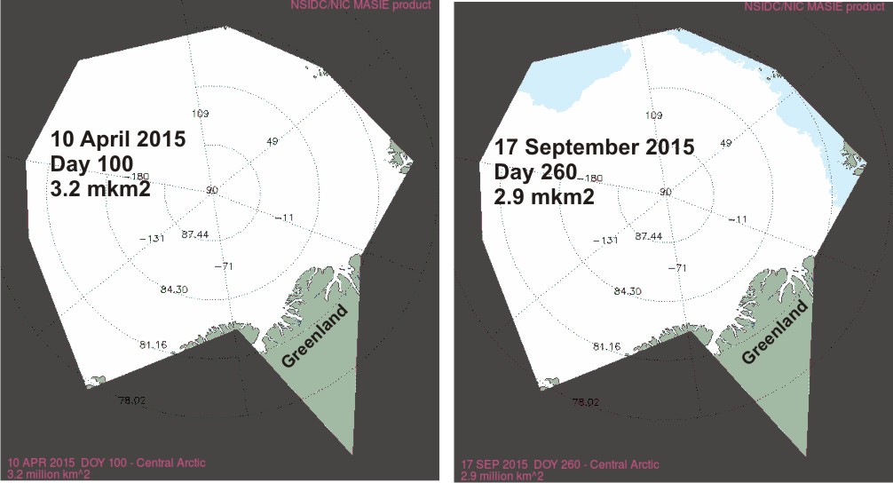 Below are NSIDC MASIE sea ice maps for 10 April 2015 (as big as it gets, basin filled) vs. 17 September 2015: