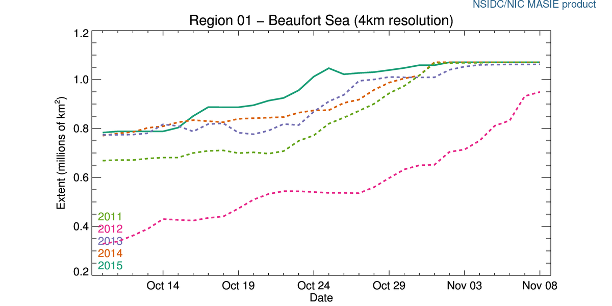 Here is how that sea ice looks on the landscape (as of 8 November 2015): the Beaufort Sea totally ice-covered, the Chukchi Sea still open water.