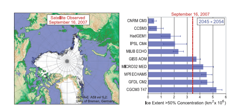 Figure 3. From Amstrup, Marcot & Douglas 2008, caption from original (as per American Geophysical Union): Area of sea ice extent (>50% ice concentration) on 16 September 2007, compared to 10 Intergovernmental Panel of Climate Change Fourth Assessment Report GCM mid century projections of ice extent for September 2045–2054 (mean ±1 standard deviation, n = 10 years). Ice extent for 16 September 2007 was calculated using near-real-time ice concentration estimates derived with the NASA Team algorithm and distributed by the National Snow and Ice Data Center (http://nsidc.org). Note that five of the models we used in our analyses project more perennial sea ice at mid century than was observed in 2007. This suggests our projections for the future status of polar bears may be conservative. Image credit: American Geophysical Union.
