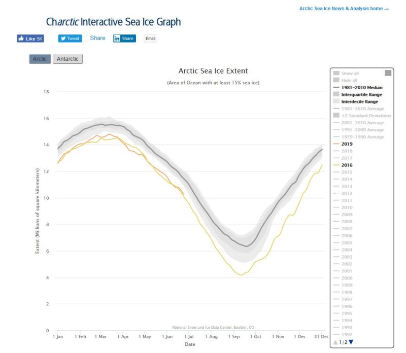 Sea ice extent 2016 vs 2019 at 24 June_NSIDC interactive