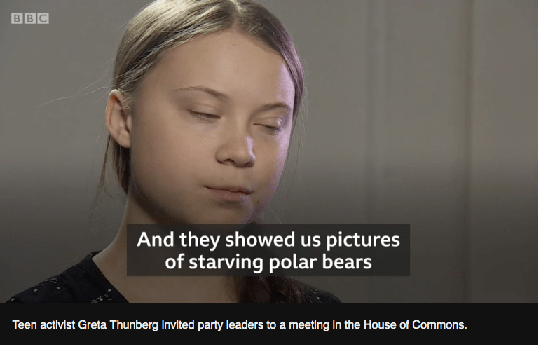 BBC video screencap with Thunberg video quoting starving pb images_23 April 2019