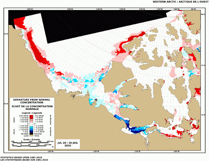 Western Arctic weekly departure from normal 2020 July 20