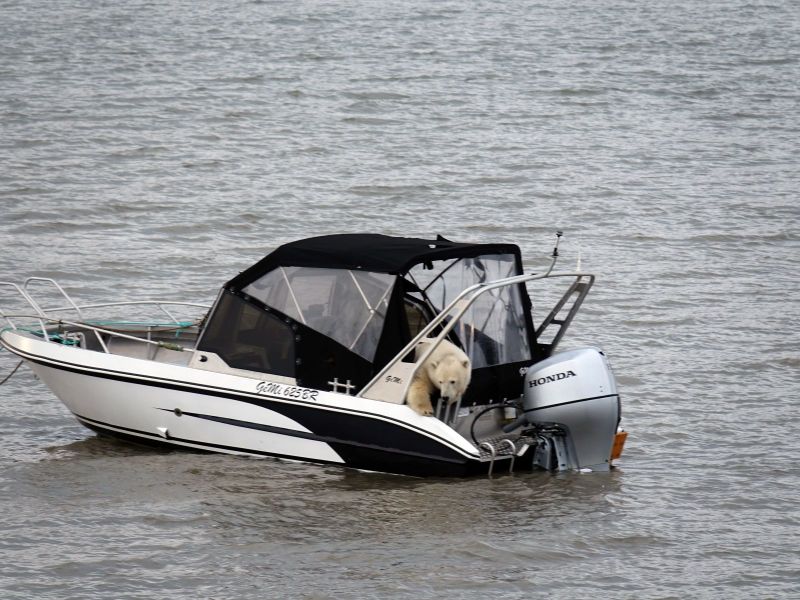 Svalbard polar bear on motorboat_Sept 2019 Svalbardposten_long view