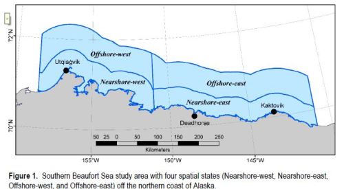 “Survey results substantiated that a major, short-term shift in density had indeed occurred. Density of seals in the Beaufort Sea was down 10 fold with a corresponding increase in the Chukchi Sea of between 10 and 15 fold.