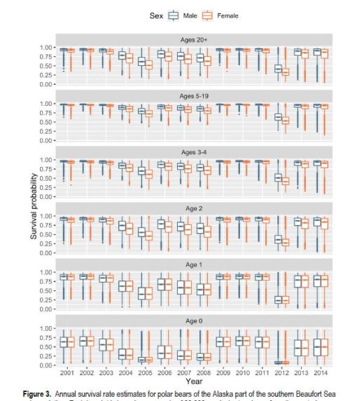 A just-released report on the latest count for the Alaska portion of the Southern Beaufort subpopulation reveals that numbers have been stable since 2010 despite claims the population has continued to decline. However, the study also has a very odd feature: 2012 had the highest population estimate over the decade of 2006-2015 yet also had the lowest survival of all age classes since 2001.