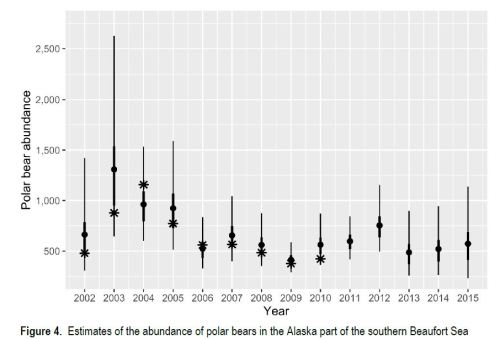 The last population count of polar bears in the Southern Beaufort Sea covered the years 2001-2010 (Bromaghin et al. 2015). In that study, the 2010 estimate for the same area of Alaska as the most recent study was 562 (range, 363-873). For 2015 , the estimate was 573 (range, 232-1,140) – see their Fig. 4 below – and the average estimated abundance for the entire 2006-2015 period was 563 (range, 340-920)(Atwood et al. 2020).
