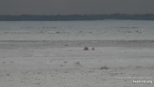 Polar bear mother and cub appear to be feeding on new shorefast ice off Wakusp National Park, Western Hudson Bay. 11 November 2020.