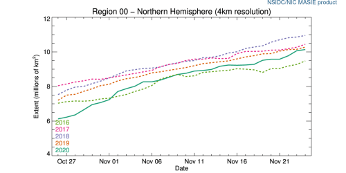 Overall, there was more sea ice at 24 November 2020 than there was on the same date in 2016, which was the last year that a number of polar bear subpopulations were surveyed, including Western and Southern Hudson Bay, Southern Beaufort, Chukchi Sea (Crockford 2019, 2020), see graph below from NSIDC Masie: