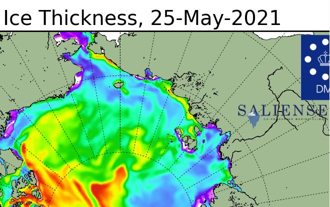 This year near the end of May the distribution of thickest sea ice (3.5-5m/11.5-16.4 ft – or more) is a bit surprising, given that the WMO has suggested we may be only five years away from a “dangerous tipping point” in global temperatures. There is the usual and expected band of thick ice in the Arctic Ocean across northern Greenland and Canada’s most northern islands but there are also some patches in the peripheral seas (especially north of Svalbard, southeast Greenland, Foxe Basin, Hudson Strait, Chukchi Sea, Laptev Sea). This is plenty of sea ice for polar bear hunting at this time of year (mating season is pretty much over) and that thick ice will provide summer habitat for bears that choose to stay on the ice during the low-ice season: not even close to an emergency for polar bears.