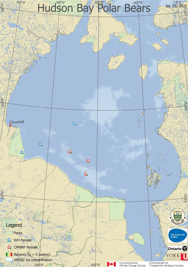 However, by 5 July, the first of six collared females from Andrew Derocher’s WH study (below) had also come ashore, as did others along the shore of Wapusk National Park. This is not ‘early’ – just earlier than the last few years. Like last year, however, there is still a fair amount of sea ice left on the bay and some bears seem to be choosing to stay out longer on what ‘experts’ describe as unsuitable habitat. As you can see on his bear tracker map, Derocher uses a filter that shows only ice >50% concentration because he and his buddies have decided that bears so dislike anything less that they immediately head to shore as soon as ice levels fall below this threshold.