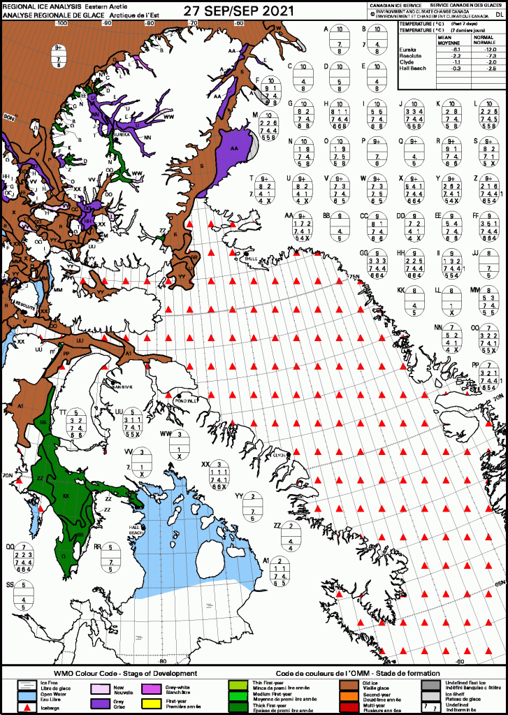 The beginnings of new ice growth in the Western Canadian Arctic shows as light and dark purple on this ‘stage of development’ chart (below) from the Canadian Ice Service for the week of 27 September 2021: