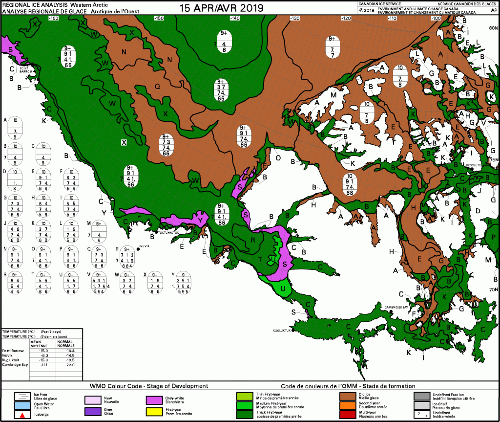 By mid April 2019, that thin first year ice had become thick first year ice at least 1.2 m thick (dark green) with a few scattered thin patches in areas where polynya formation is routine: