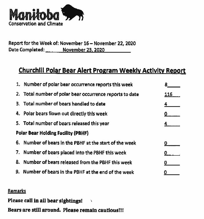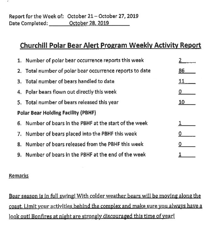 Although since 2015 at least the Polar Bear Alert Program in Churchill Manitoba usually issued and published its problem bear reports weekly during the ice-free season, this year has been an odd exception. Two reports in early July, then nothing. Yesterday, there was a dump of reports that had been compiled on 1 September and 7 October, according to their metadata.