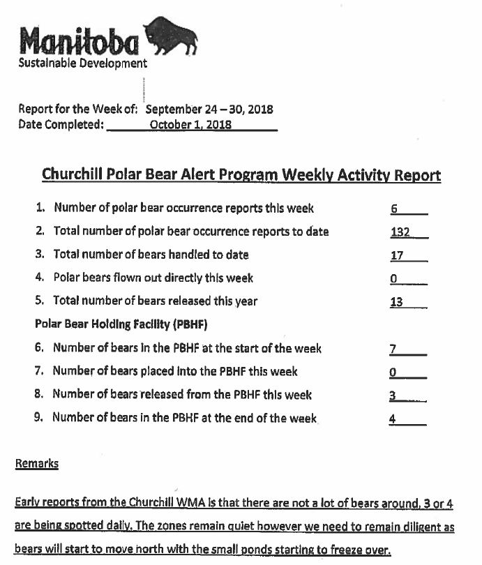 There are still a few weeks missing, including the two most recent weeks but at least now we have a more complete picture of what’s been going on with problem bears in The Polar Bear Capital of the World that can be compared to previous years. Such reports in various forms go back to the late 1960s, although only those from recent years have been publicly available (Kearney 1989; Towns et al. 2009).