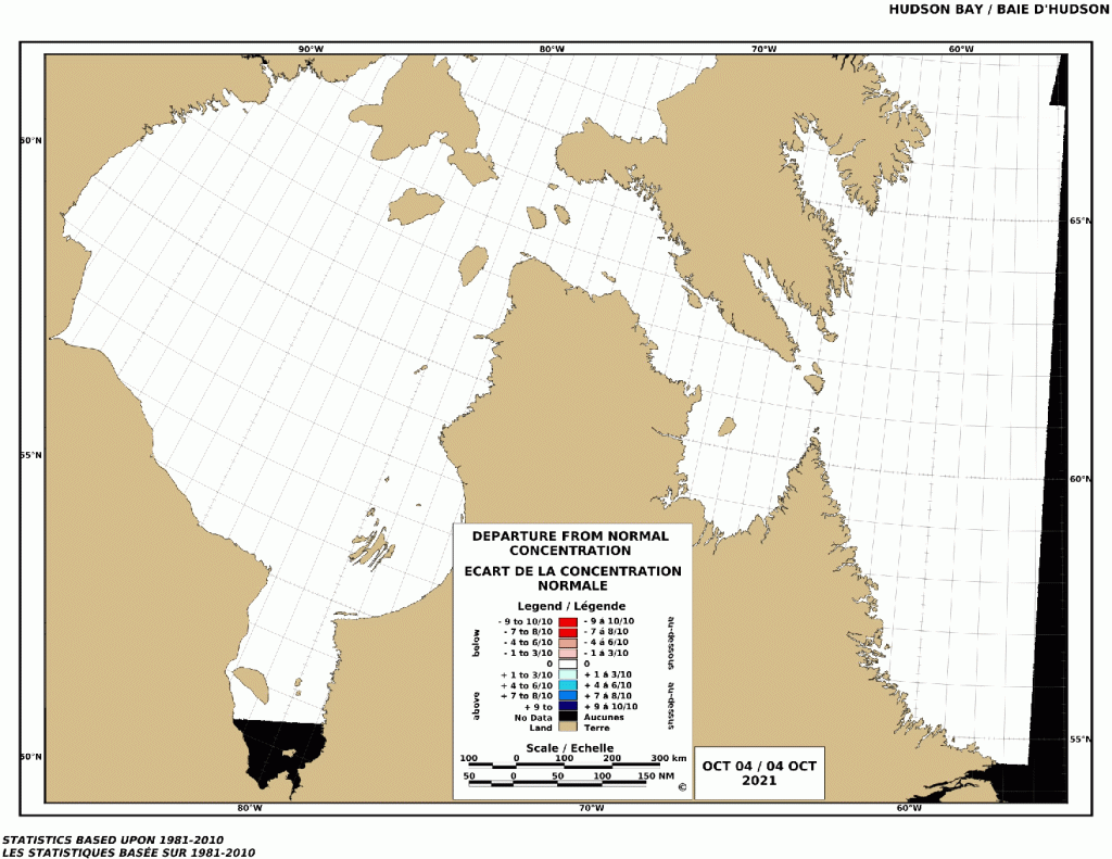 There is still no ice on the shore of western Hudson Bay as of this date (which is entirely normal, see chart below for the week of October 4) but there is still no way to know if this will be an early or late year for ice formation on the bay.