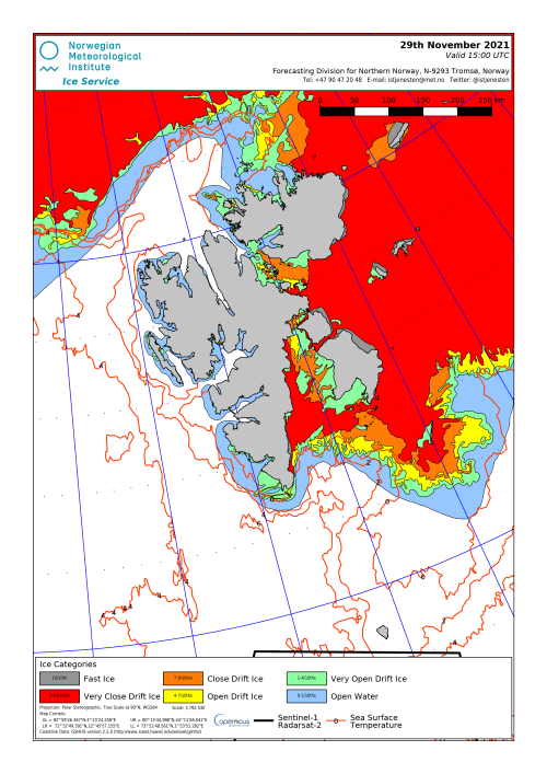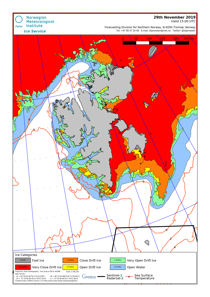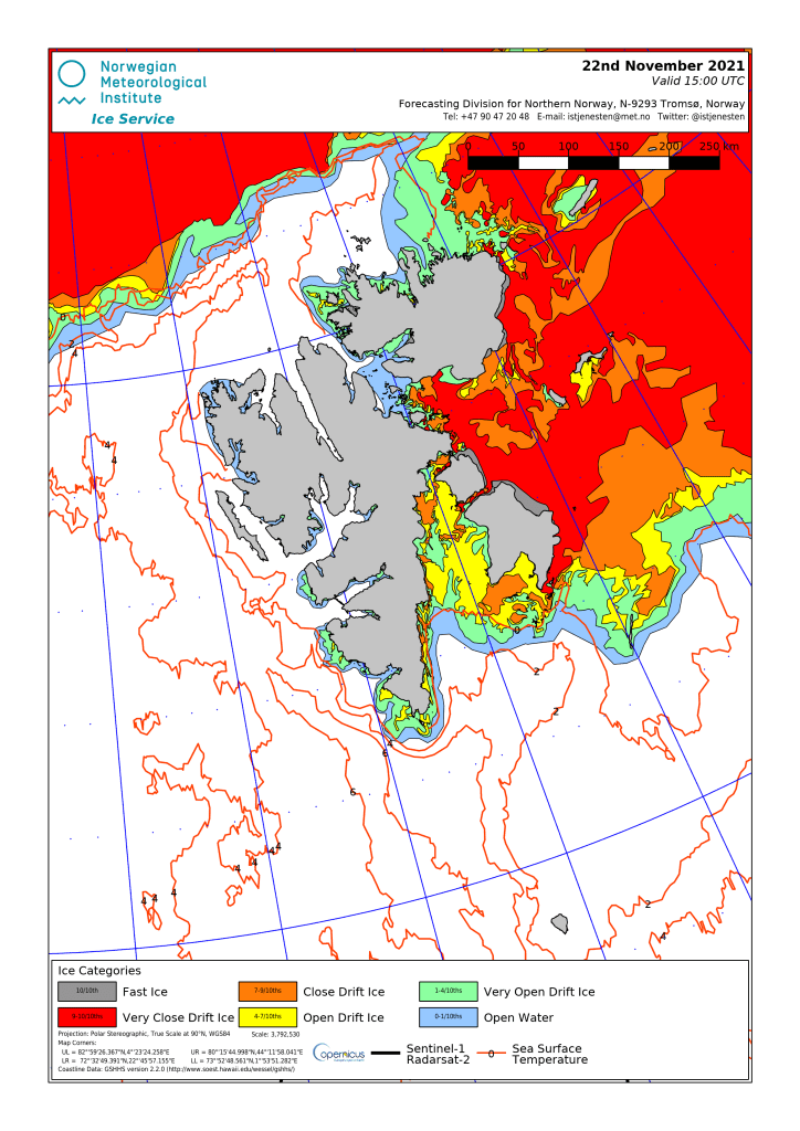 The graph Derocher pulled from his 2011 paper on Hopen Island maternity denning vs. ice levels in the above tweet suggests that at least some females should use the island if sea ice reaches it before the end of November, as it did this year (see below). Hopen is the long skinny island at the south-eastern edge of the ice (the island is actually easier to locate in the 2020 chart below):