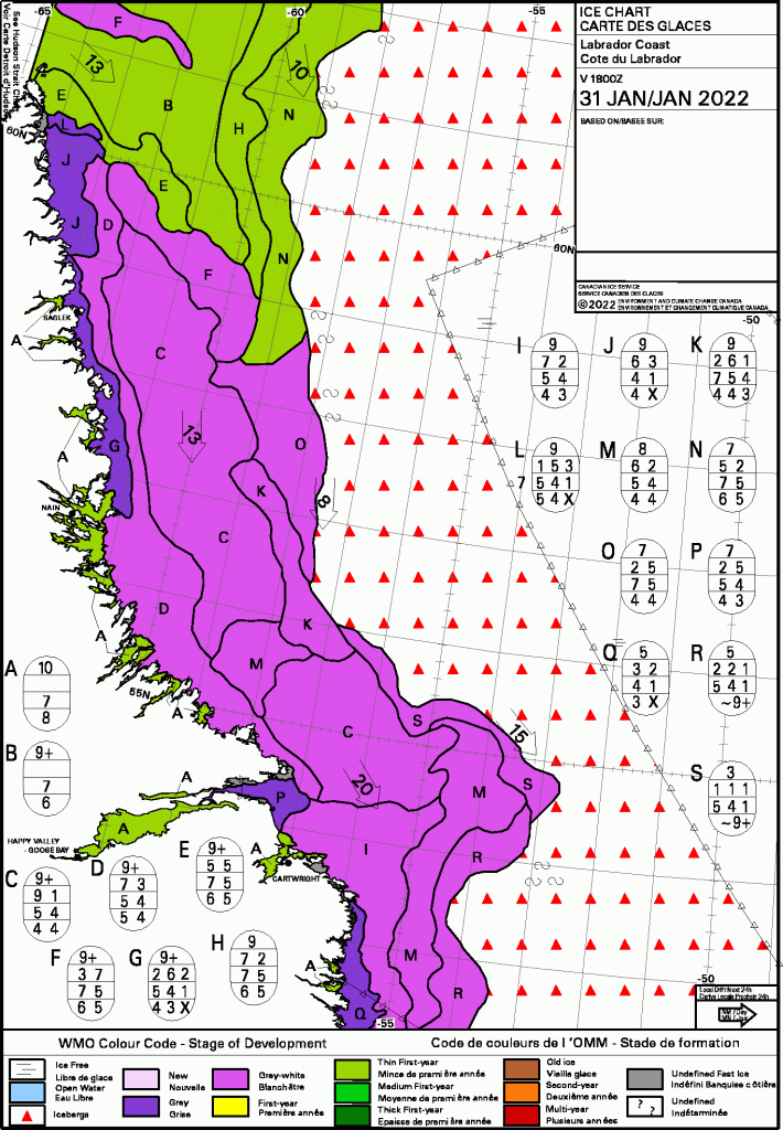 Sea ice conditions this year show Davis Strait ice (light green) moving south rapidly against thinner, newly-formed ice (purple) along the coast.