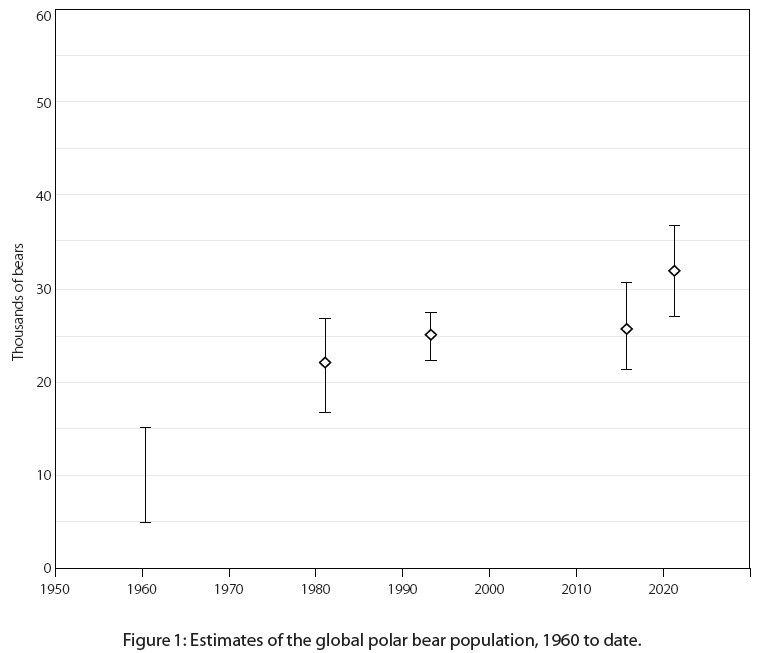 Crockford further clarifies that the global population estimate used by the PBSG has not been updated since 2015, even though the results of numerous surveys have been published since then. These additions bring the global population total to almost 32,000, up from about 26,000, albeit with a wide range of potential error. This modest increase is consistent with a species recovering from low numbers brought about by overhunting that affect it before focused international protection was introduced in 1973.