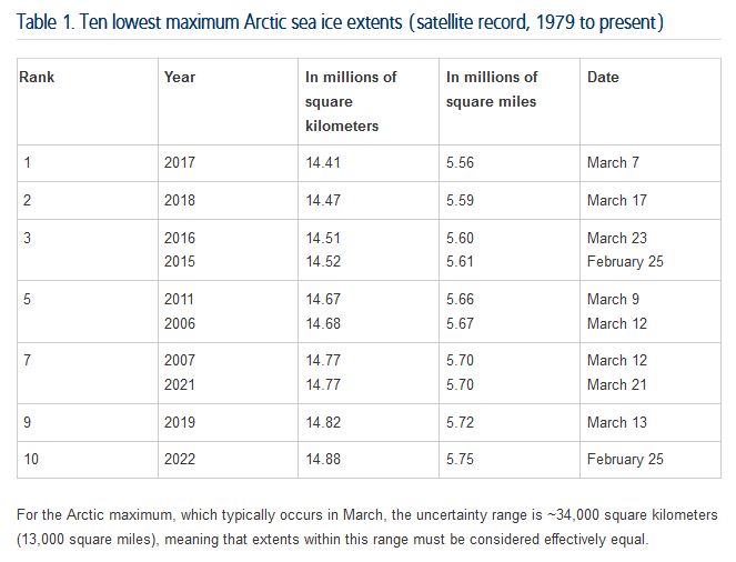 On February 25, 2022, Arctic sea ice likely reached its maximum extent for the year, at 14.88 million square kilometers (5.75 million square miles), the tenth lowest extent in the satellite record. [See their Table 1, below] This year’s maximum extent is 770,000 square kilometers (297,000 square miles) below the 1981 to 2010 average maximum of 15.65 million square kilometers (6.04 million square miles) and 470,000 square kilometers (182,000 square miles) above the lowest maximum of 14.41 million square kilometers (5.56 million square miles) set on March 7, 2017. Prior to 2019, the four lowest maximum extents occurred from 2015 to 2018.