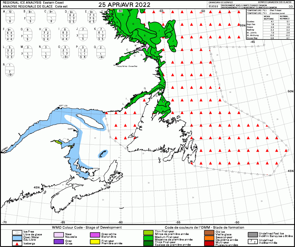 Excerpt below from the CBC story (‘Polar bear spotted on Gaspé peninsula killed by wildlife officers‘; 30 April 2022), but first you’ll need the map of the area. Charts for sea ice conditions at the time follow.