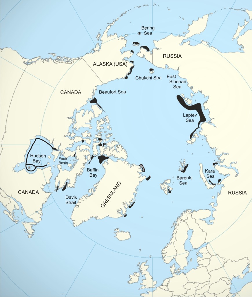 From my paper, without the labels (Crockford 2022, open access). Some polynyas, like the huge area off Siberia, are not often actually open water but areas of thin ice that seals and bears can break through easily. Because of that, they are often difficult to spot on sea ice charts.