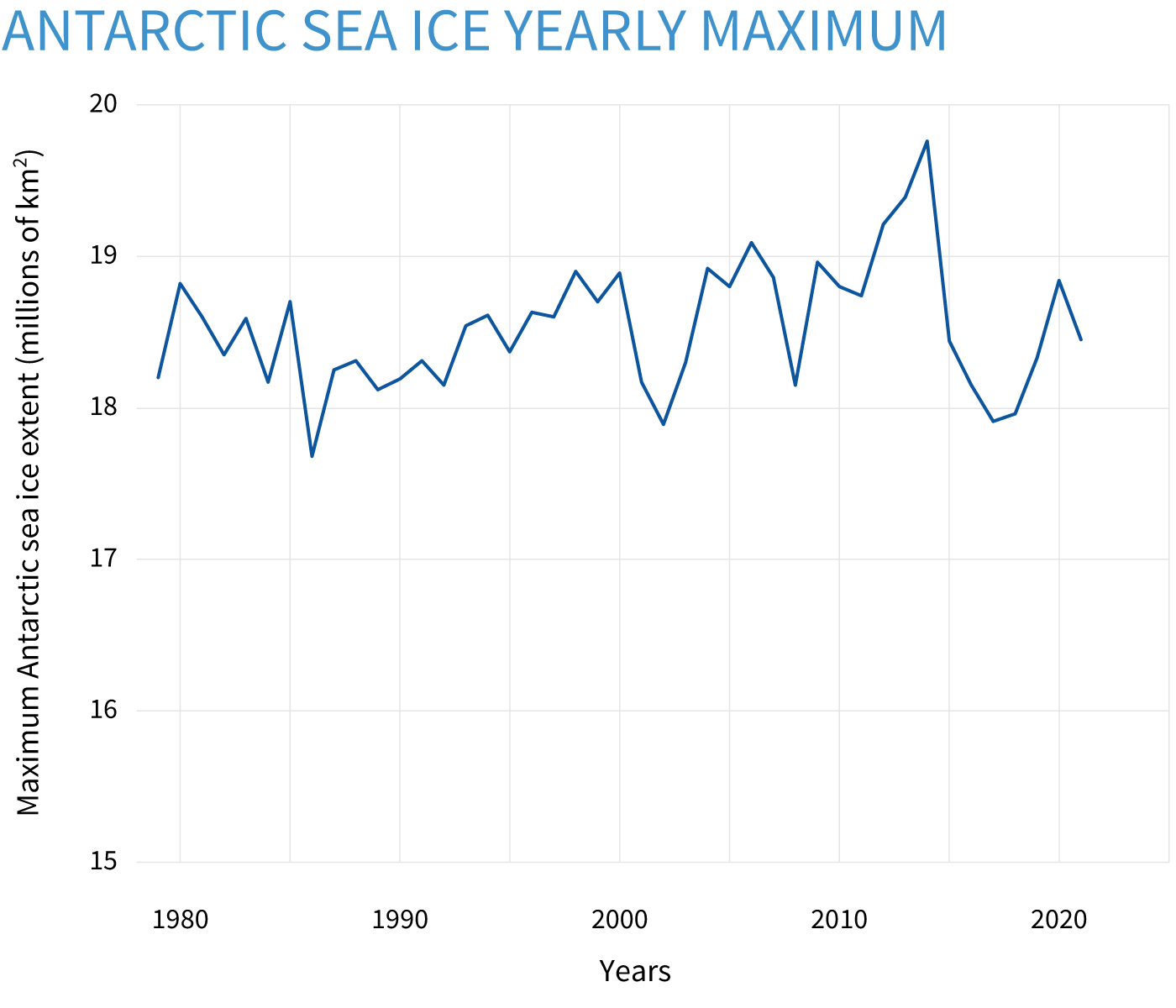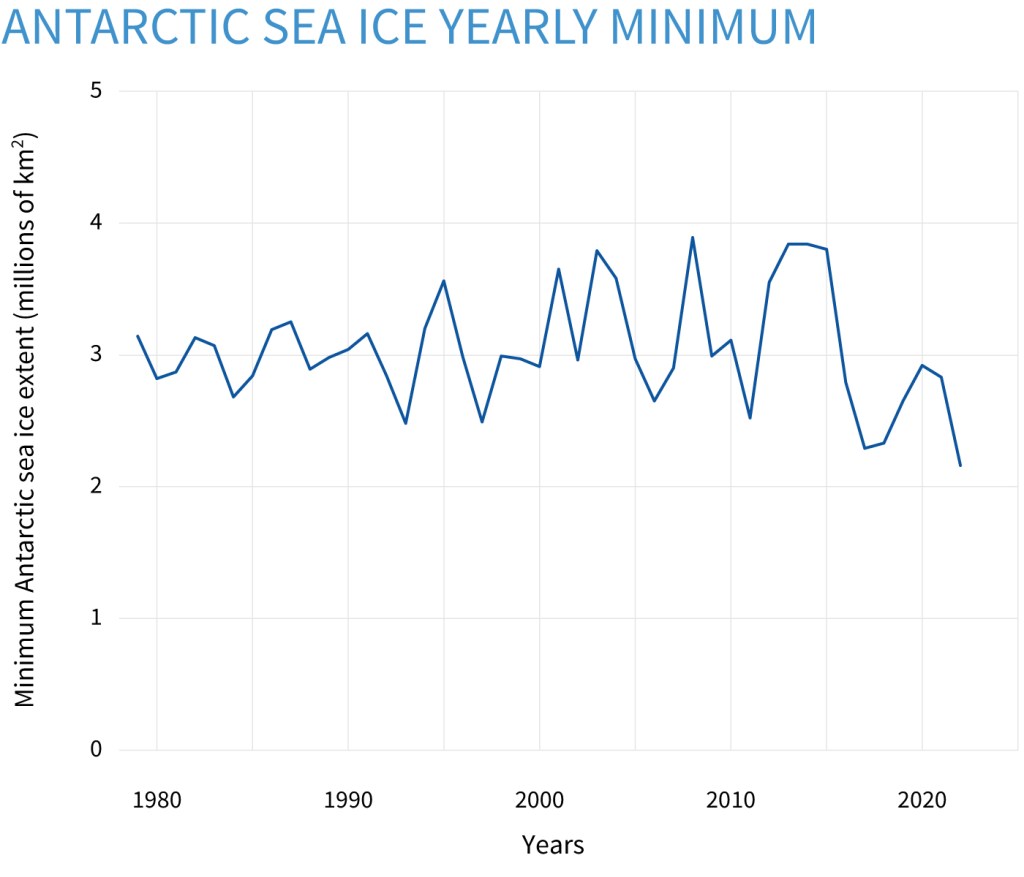 The minimum extent for Antarctic sea ice since 1979 has been highly variable without showing a meaningful long-term declining trend, with extent for a few years recently lower than average but many years well above average. The graph below is based on data from NSIDC for February 2022: