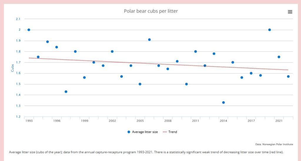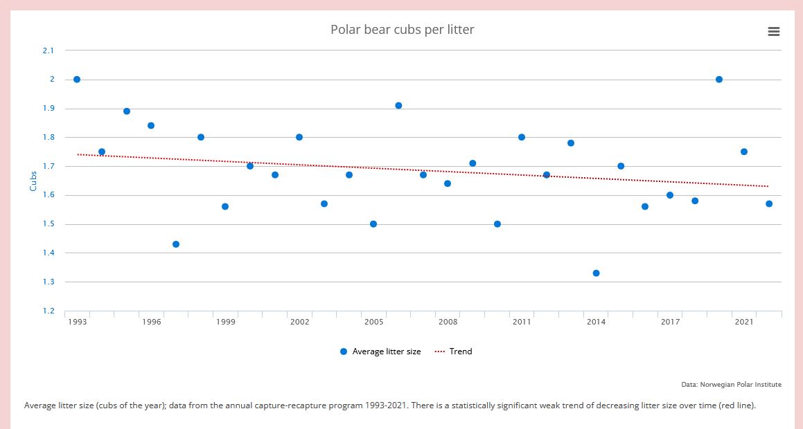 Litter size was slightly below average this year but note how high it was in 2019 (‘2.0’), the year after what should have been a devastating year for these bears after such low summer ice in 2018 (note that a point for 2020 is missing due to pandemic restrictions on field research). Overall there is a slight but statistically significant declining trend since 1993: