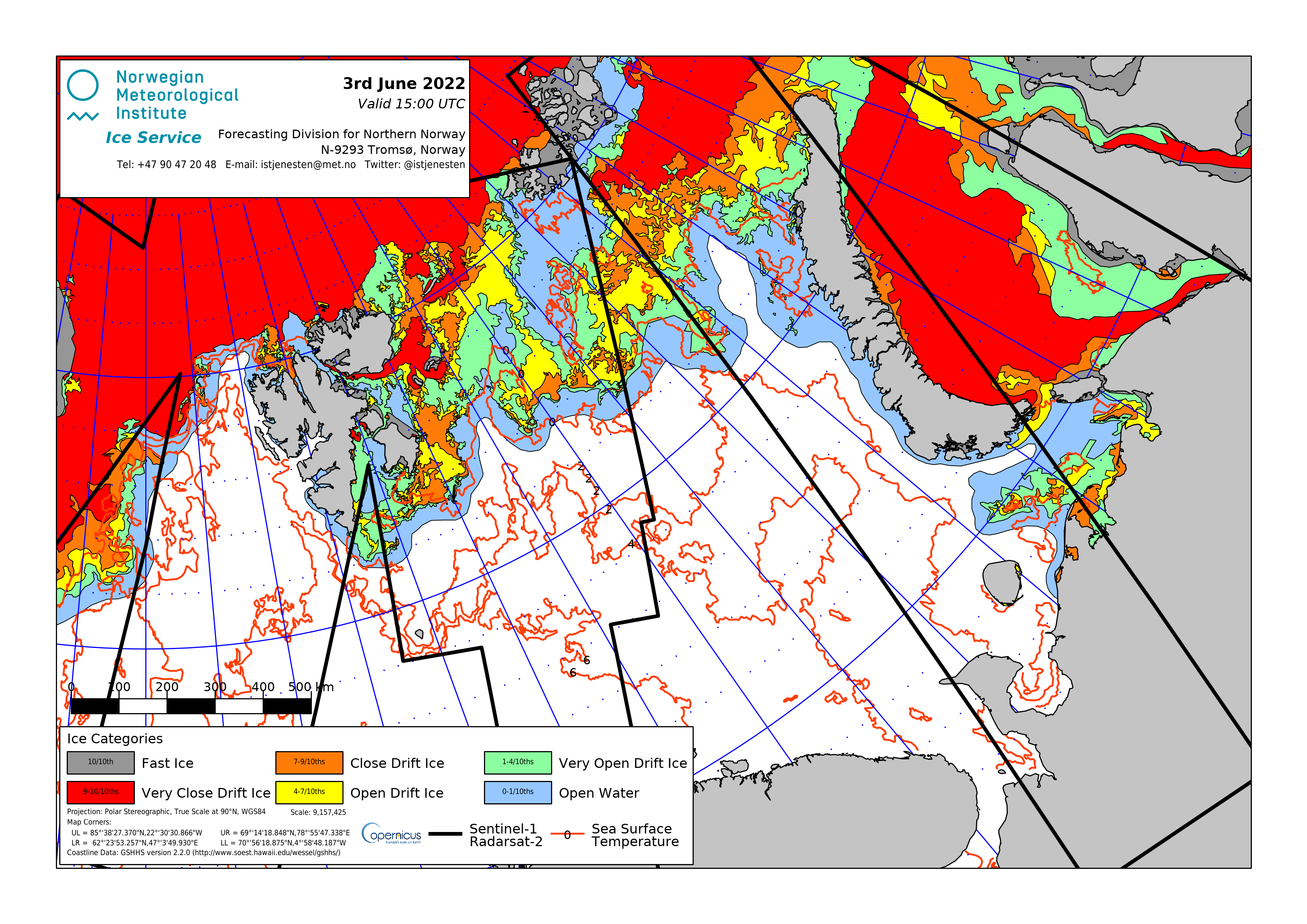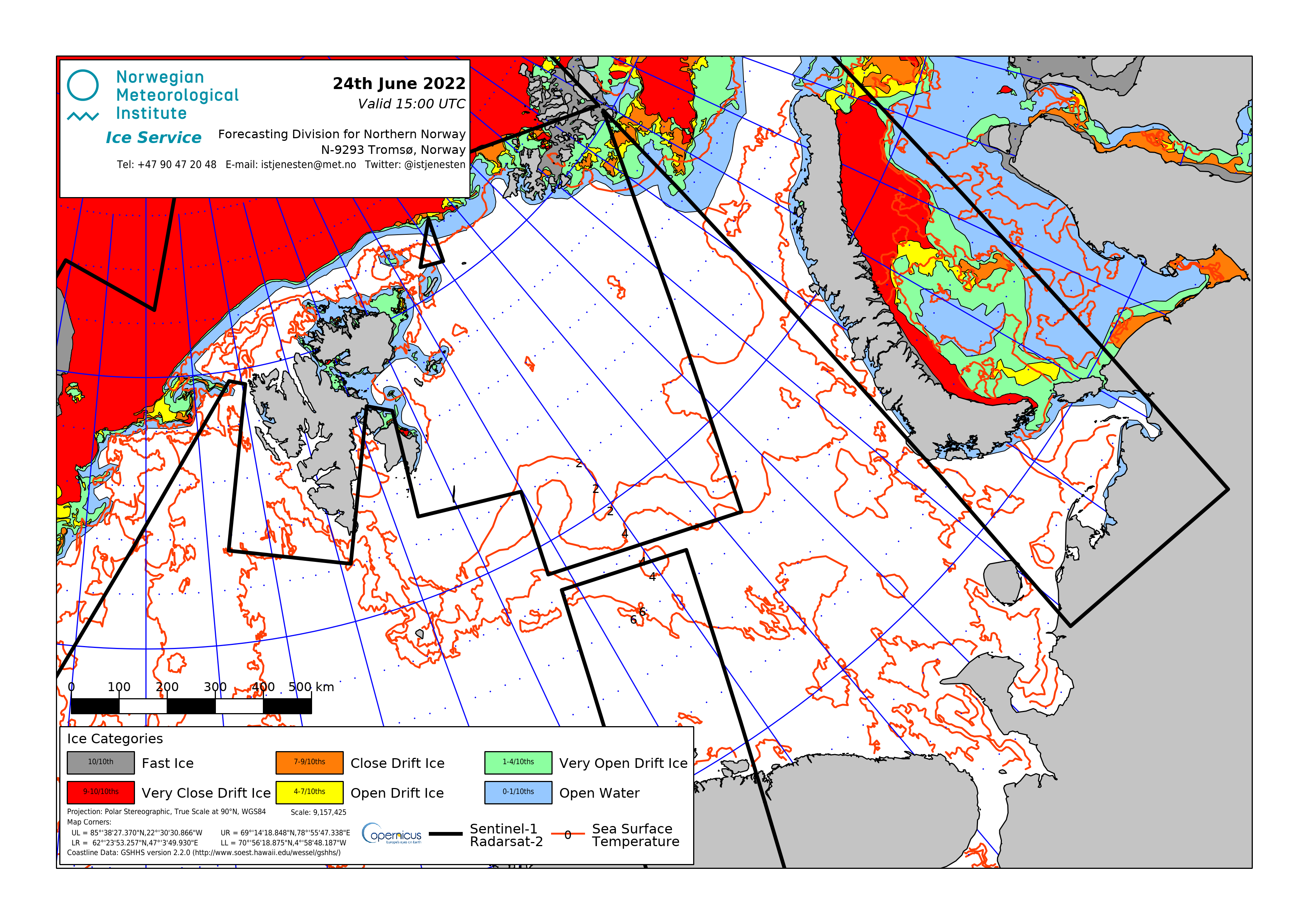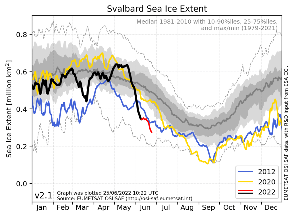 The graph above shows 2022 didn’t have the lowest ice coverage on 25 June in recent times and a tweet report by the Norwegian Ice Service (below) stated that the lowest coverage on that date was reached in 2018 (closely followed by 2006):