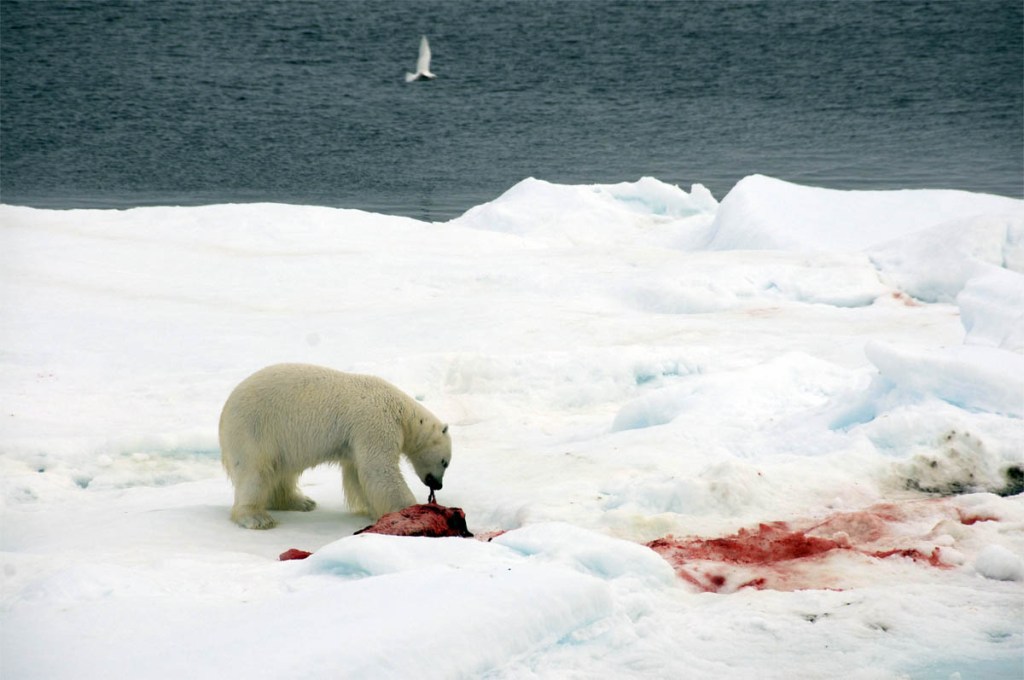 At this time of year, multi-year ice is an important refuge habitat for many polar bears when seasonal ice melts out. However, it provides few opportunities for hunting seals. In fact, it is nearly as devoid of food as is the shore during the melt season. Consequently, most polar bears eat little over the summer whether they are on land or on sea ice due to the scarcity of seals.