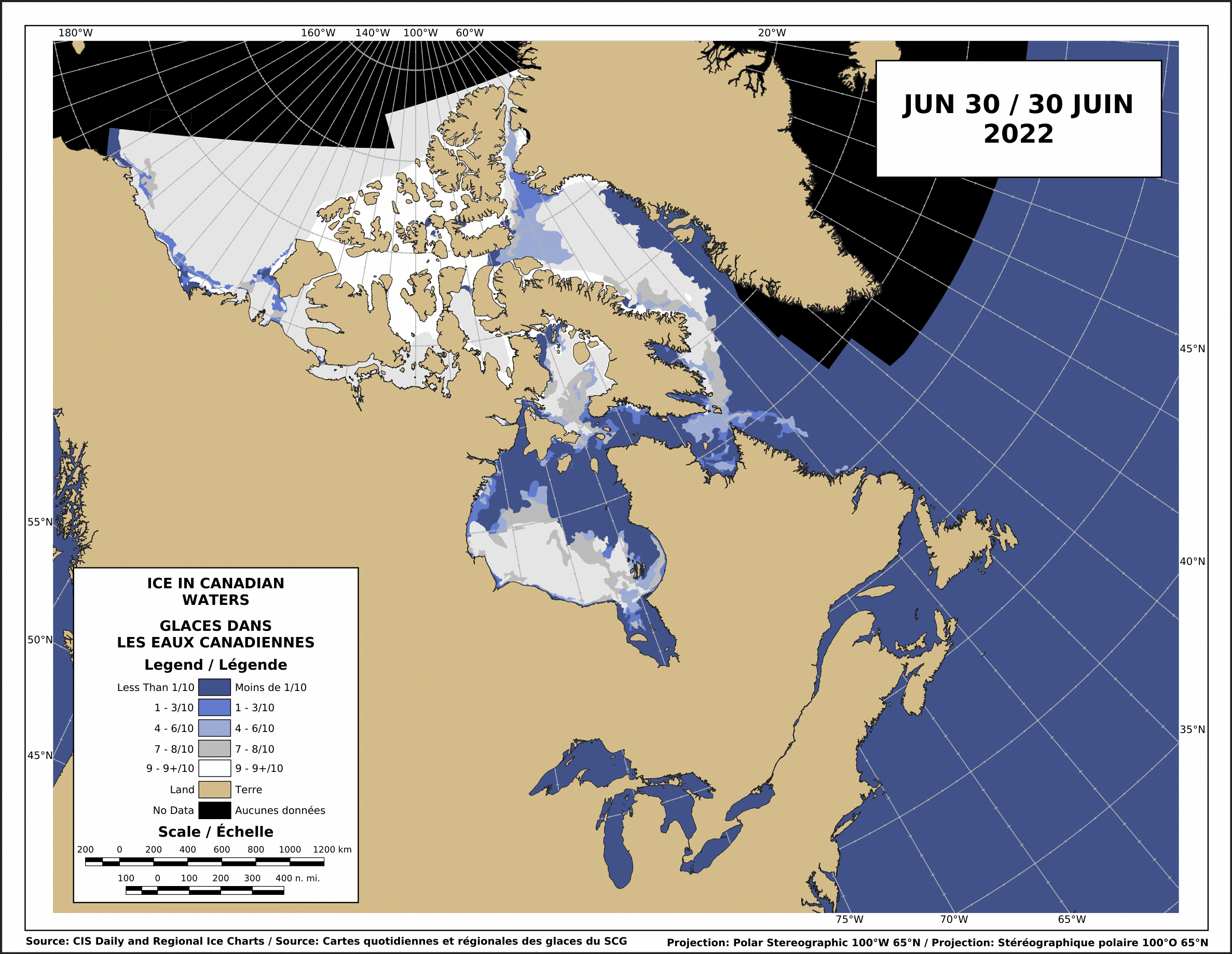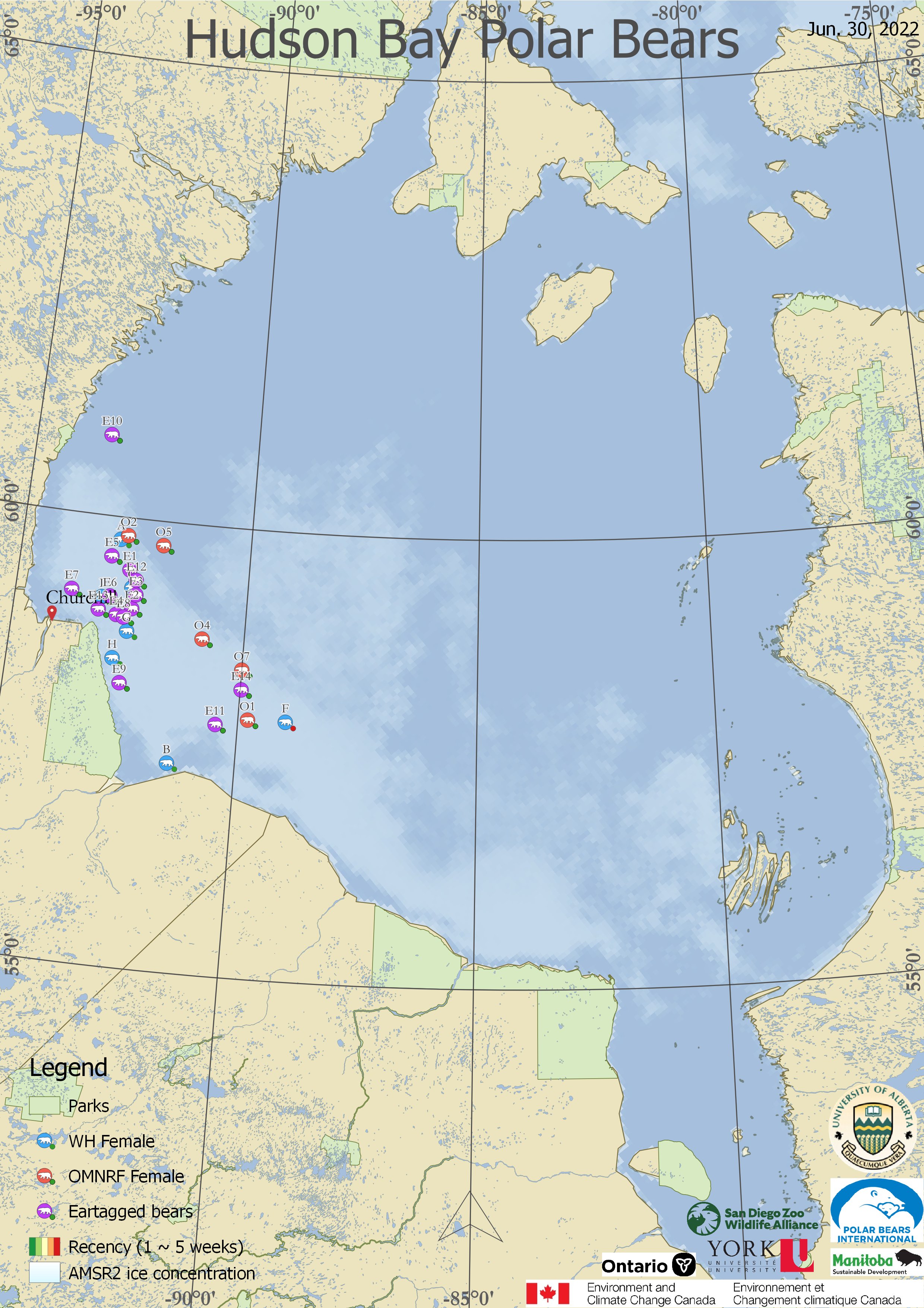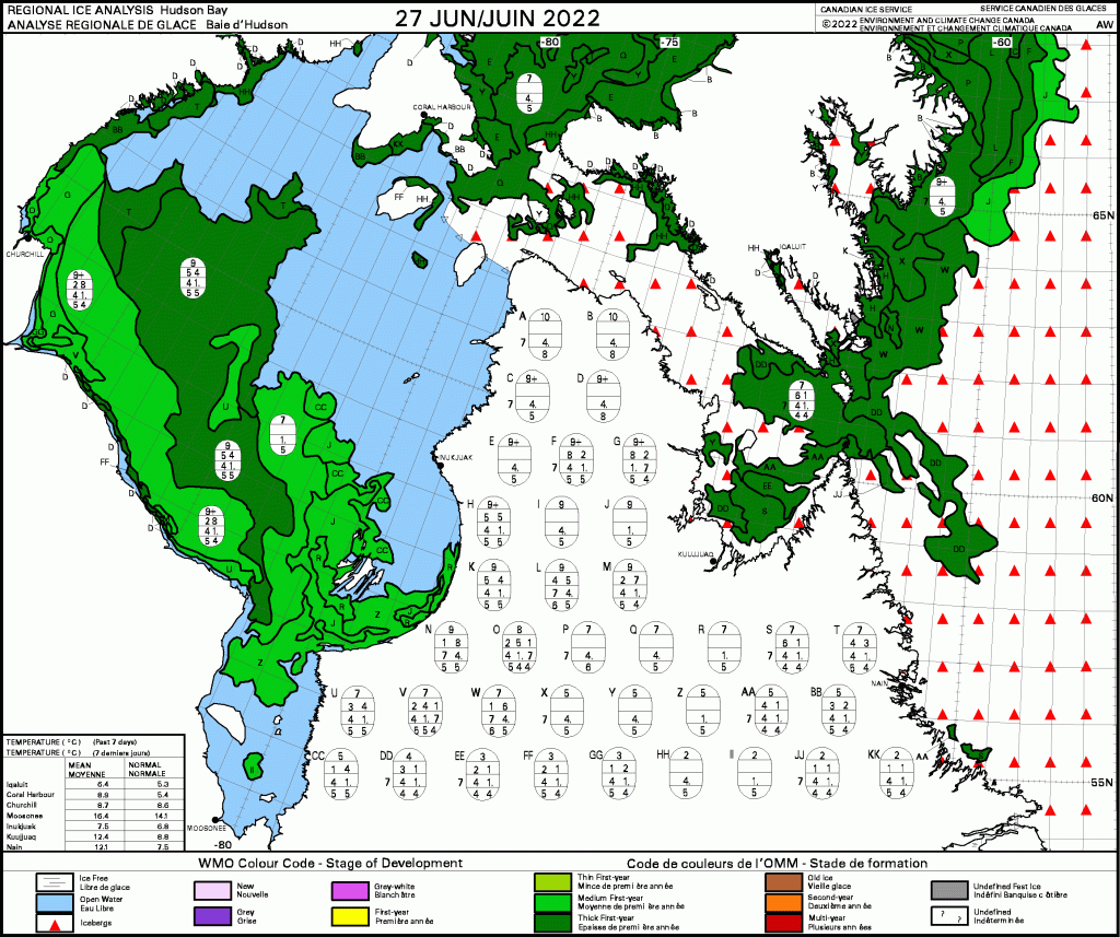 Sea ice on Hudson Bay is still abundant in the southwest sector, including around Churchill, and much of that is still thick first year ice (>1.2m thick, dark green on the ‘stage of development’ charts).