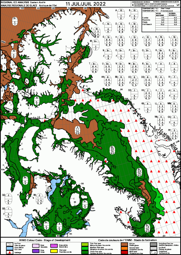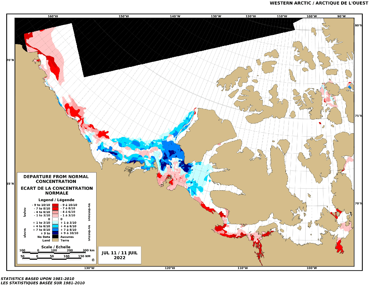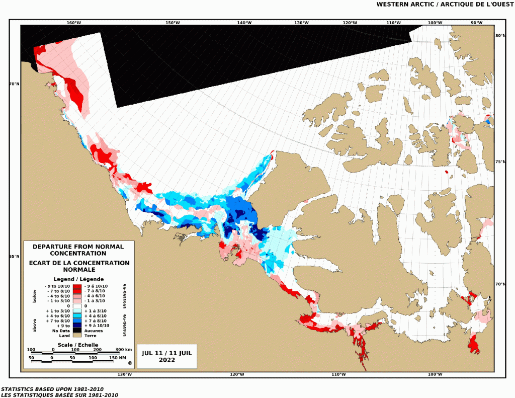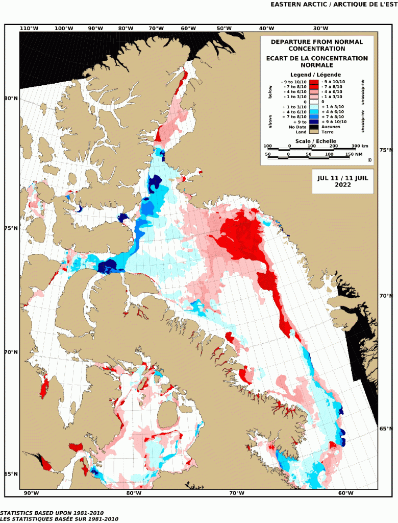 Note that regional charts are for the week of July 11, shown here by ‘stage of development’ (ice thickness, with brown being old, multiyear ice and dark green ice >1.2m thick) and in the ‘departure from normal’ charts, dark blue is much more than average and dark red is much less.