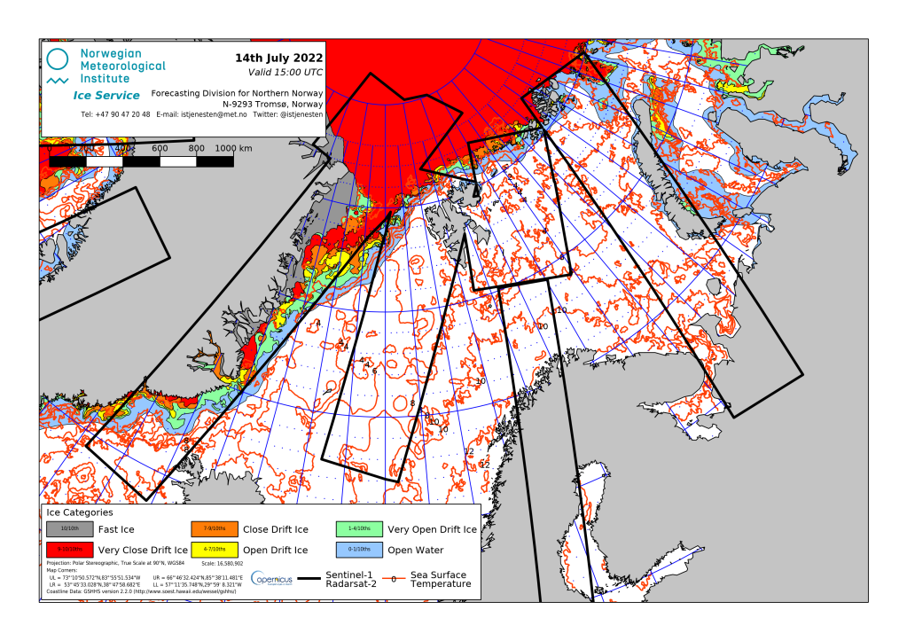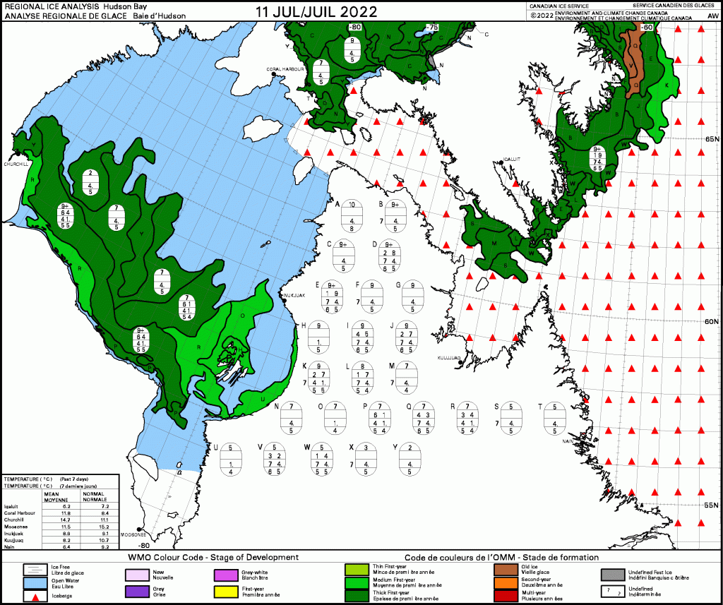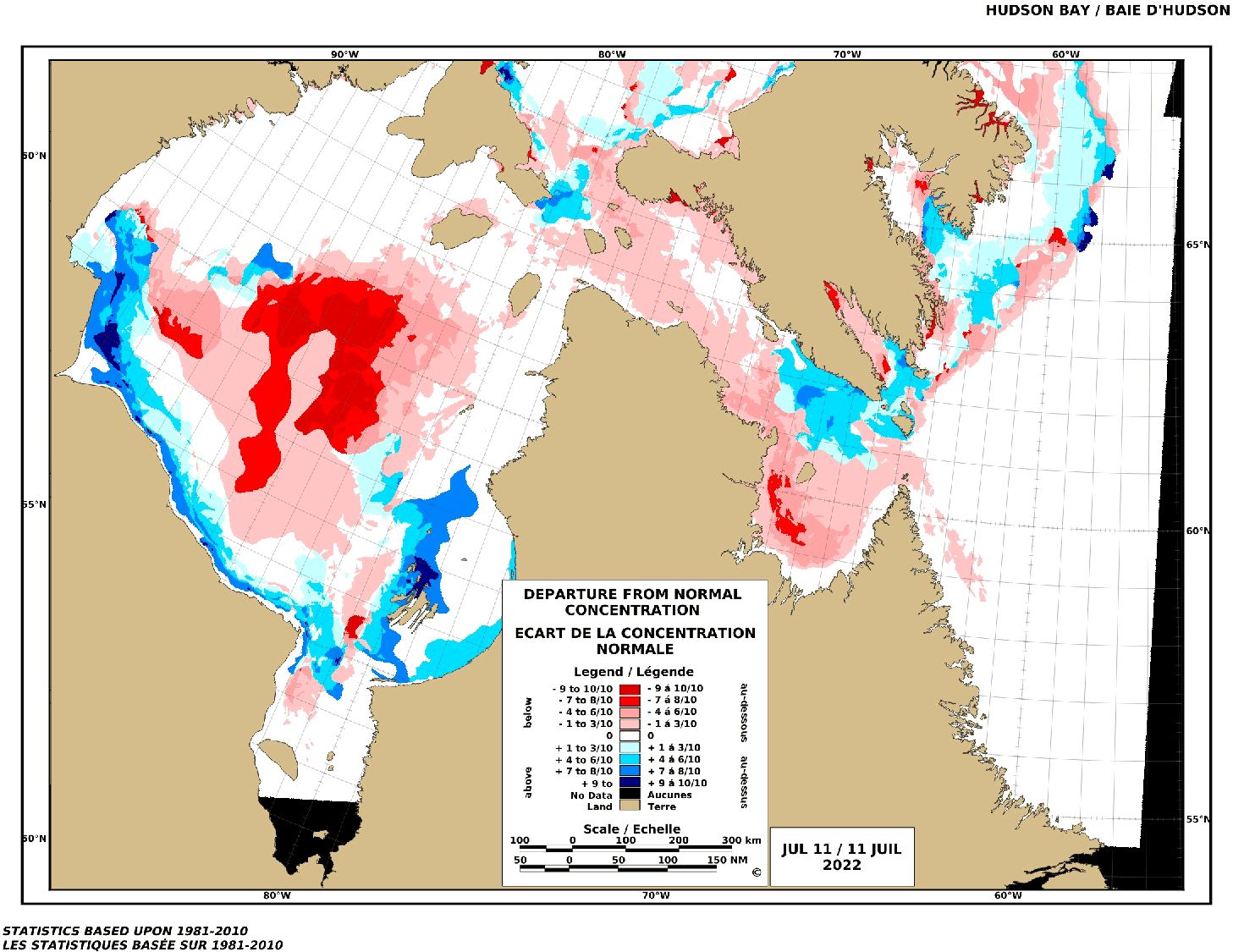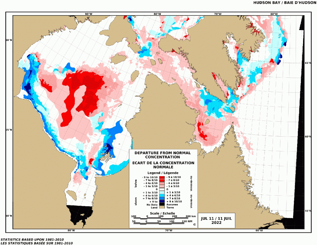 Note that regional charts are for the week of July 11, shown here by ‘stage of development’ (ice thickness, with brown being old, multiyear ice and dark green ice >1.2m thick) and in the ‘departure from normal’ charts, dark blue is much more than average and dark red is much less.