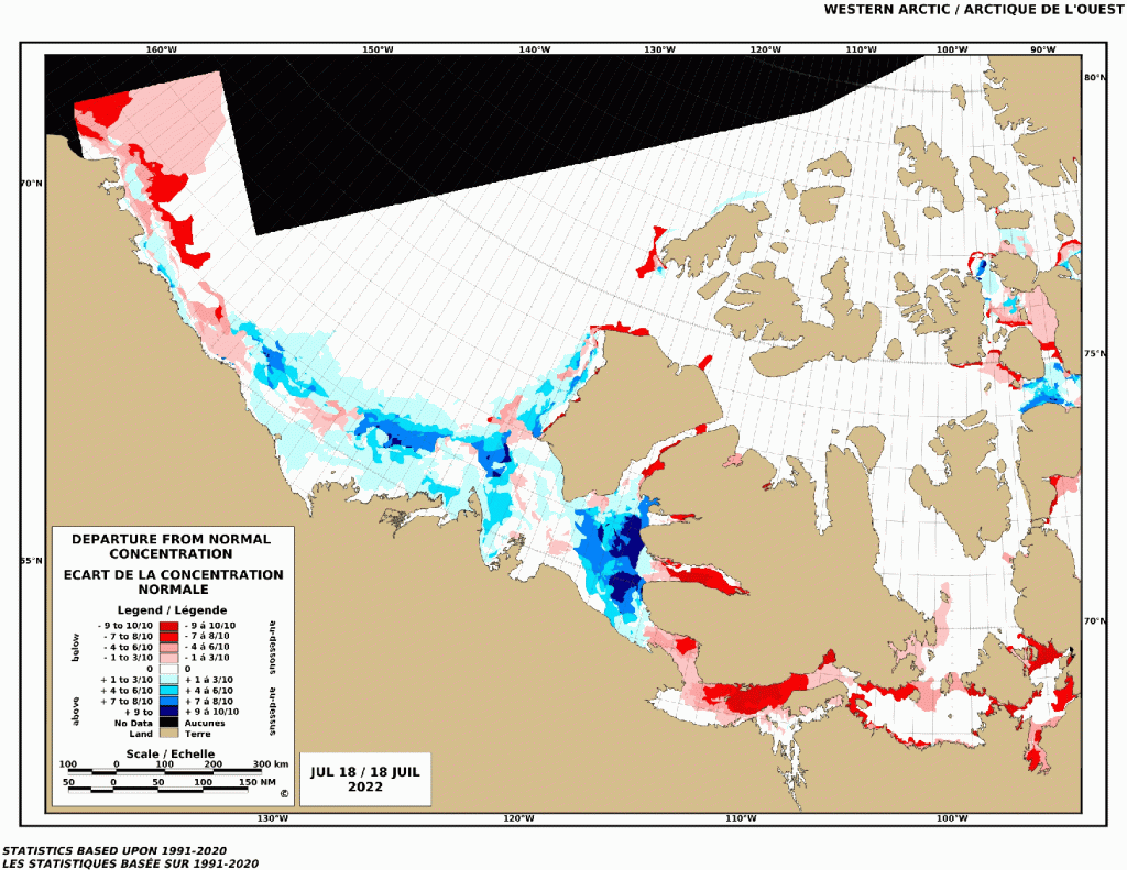 Compared to the longterm average the western Canadian Arctic has slightly less ice than usual this year due to much more ice than usual in the eastern Beaufort (blue) being offset by less ice in the western Beaufort/Chukchi Sea:
