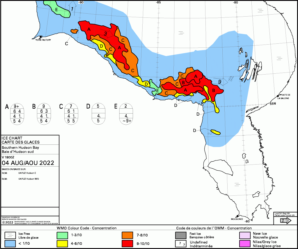 Daily charts for 4 August 2022 by concentration (below), Northern and Southern Hudson Bay (note all of this ice, as in the chart above, is first year ice >1.2m thick):
