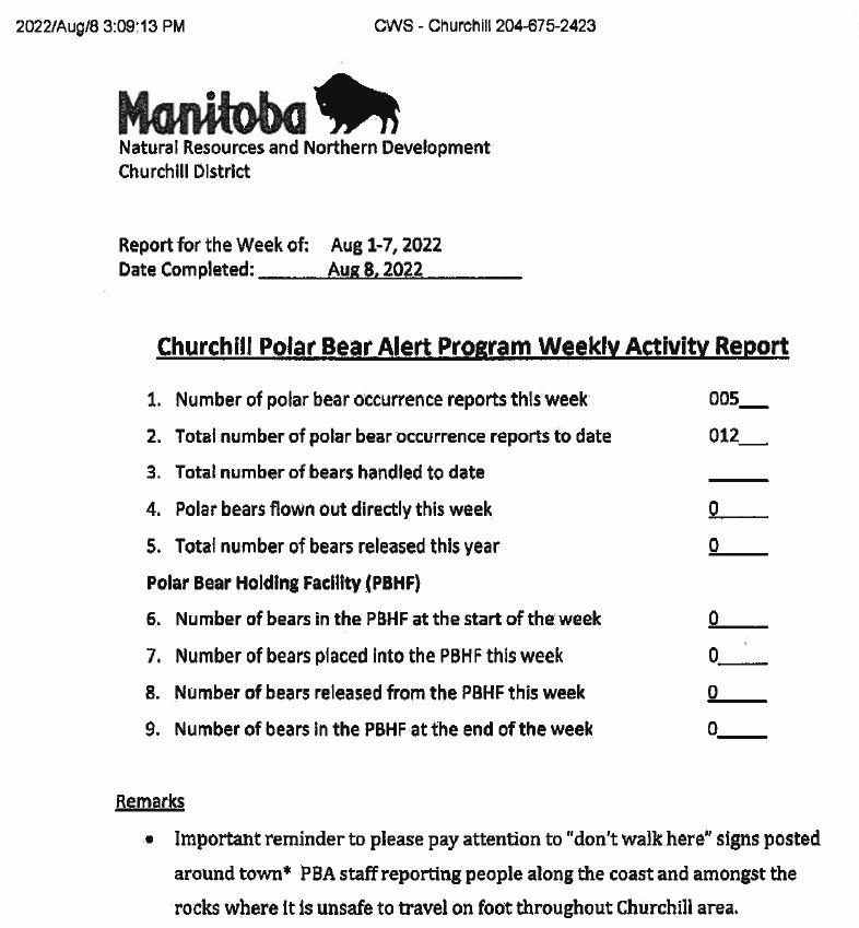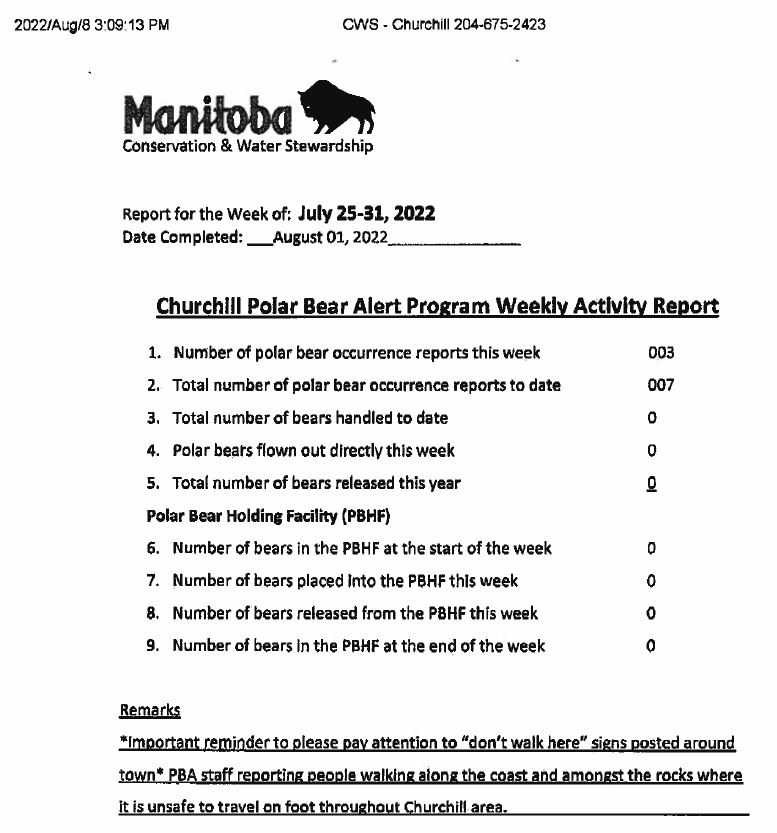 The first few reports on problem polar bear activity in Churchill are in, posted early this week (two together), starting the last week of July (25-31).