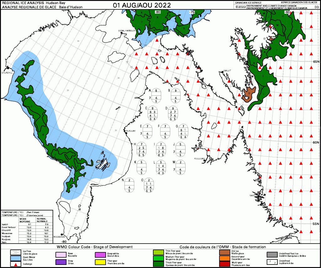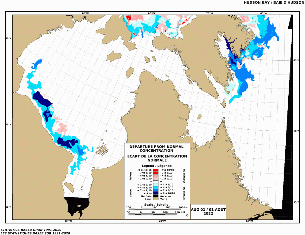 Showing much more ice than usual (light and dark blue) for this time of year. So why did some bears come ashore (and wander into town to cause problems) when many others remained on the ice offshore? Apparently, the answer is that the amount of ice doesn’t matter: some bears come ashore when they feel like it, at a location they prefer to spend the summer.