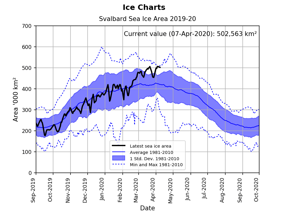 The answer to the conundrum of polar bear survival in Svalbard is that sea ice in Spring (i.e. April-May), when the bears do most their feeding, is abundant and that has not changed in recent years, as this sea ice area chart for 7 April 2020 shows: